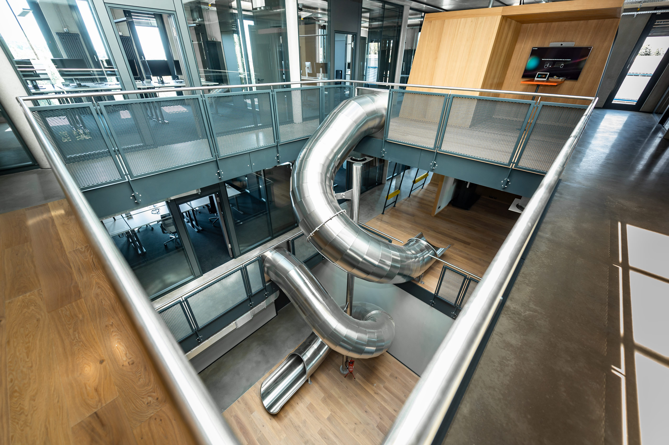 In der Galerie des Bürogebäudes CID in Freigericht / Hessen befinden sich drei Tunnelrutschen der atlantics Attraktionsmanufaktur. Neben den unzähligen Möglichkeiten für Entspannung und regen Austausch wird den Mitarbeitern eine besondere Attraktion geboten. Über die Edelstahl-Röhrenrutschen können die Mitarbeiter vom obersten Stockwerk des Bürogebäudes bis in die Lobby rutschen. Die Rutsche offeriert den Mitarbeitern dabei eine Menge Spaß sowie Ablenkung, um die Kreativität am Arbeitsplatz zu steigern. Die hochwertig gefertigten Tunnelrutschen passen sich dabei gut in die vorhandene Architektur des modernen Bürogebäudes ein.